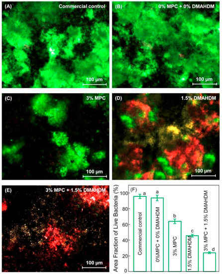 Representative live/dead staining images of biofilms grown over different dental resin composite samples: (A) commercial control; (B) 0% MPC + 0% DMAHDM; (C) 3% MPC; (D) 1.5% DMAHDM; (E) 3% MPC + 1.5% DMAHDM and (F) area fraction of live bacteria. Adapted from Reference [64], with permission from © 2020 Elsevier.