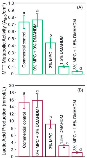 The combination of MPC and DMHADM in dental composites reduced the protein adsorption and also resulted in significant antibacterial action, as shown in the live/dead images in Figure 9D,E [64]. This is also reflected in the significant reduction in lactic acid production represented in Figure 10. This combination provides a dual anti-cariogenic strategy since MPC reduces the attachment of microorganisms by minimizing the protein coating and increases the contact surface area between the DMAHDM and the formed biofilm allowing the contact-killing induction by DMAHDM to be effectively conducted. These results suggest that protein-repellent and contact-killing polymers could be included in the resin composite system to diminish the risk of secondary caries around dental restorations.