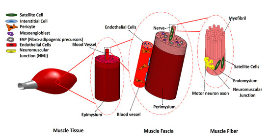Skeletal muscle consists of bundles of oriented multi-nucleated muscle fibers (myofibers) that are surrounded by connective tissue, along with branches of blood vessels and peripheral nerves that supply blood flow and electrical signals to the muscle. Thus, a variety of cell types work in concert to form the skeletal muscle structure (Figure 1). Following injury, skeletal muscle normally regenerates new myofibers after the inflammatory and repair phases of healing, leading to restored muscle structure and function. However, in the case of traumatic muscle injury that results in VML, chronic inflammatory responses persist, and fibrosis and scar formation override muscle regeneration. Significant loss of satellite cells and native muscle extracellular matrix (ECM), as well as fibrosis and chronic inflammation, prevent muscle regeneration and cause functional deterioration of the damaged muscle. Traditional rehabilitative or physical therapy alone has not been effective in restoring the strength and function of muscle tissue in VML injuries, because the loss of muscle fibers is so significant. Recently, however, a 13-patient cohort study that combined physical therapy with the use of scaffolds derived from decellularized porcine urinary bladder reported that 6 months after scaffold implantation muscle, strength and range of motion significantly improved in patients, by an average of 37.3% and 27.1%, respectively [5]. Although using a combination of biological scaffolds and physical therapy is promising, because of the polytraumatic nature of VML injuries, which include neural, vascular and tendon damage as well as bone fractures, and the presence of extensive fibrosis within and surrounding the muscle tissue, the need for an effective treatment that will regenerate the lost muscle fibers as well as other types of injured tissues de novo and restore muscle function is in high demand. Cell transplantation and tissue engineering approaches represent a promising solution for restoring muscle function. Some of the key considerations in tissue engineering approaches include the choice of therapeutic cell type, cell delivery method, and host immune response to the transplanted cells. In this review, we summarize the current state of cellular therapies for VML by reviewing several cells which are present in skeletal muscle tissue during normal and pathological conditions. We explore multiple potential cell sources that could play a role in muscle regeneration for VML repair, with a focus on cellular therapies at the preclinical stage.