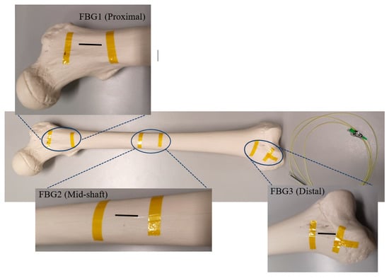 Intact femur with the secured Fibre Bragg Grating (FBG) array, including three FBGs.