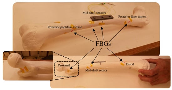 Further to fractured femur bone recovery assessment application, FBGs can also be used for long-term bone microstrain and displacement measurement. Due to the strain shielding effect in femur bone under different activities and applied loads after orthopaedic surgery [], as well as uncertainties in material properties and loads in femur computational models [], understanding strain distribution on the surface of a bone over long periods of time is of high interest. When orthopaedic implants are left in the body after the recovery process in order to prevent a second surgery, there is also a risk of bone loss due to stress shielding [,,]. Bone loss of 3–21% was reported in fractured femur and tibia bones in comparison to nonfractured ones [,,]. In osteopenic patients, this loss represents a huge risk for fracture, specifically for that of the femoral neck []. On the other hand, implant removal after completion of the healing period is associated with the usual risks of surgical treatment. Therefore, the pros and cons of implant removal surgery should be balanced to subsequently optimise the timing of this second surgery to prevent fracture recurring in the same area. This balance and timing can be obtained through accurate and reliable strain measurement using FBG sensors.