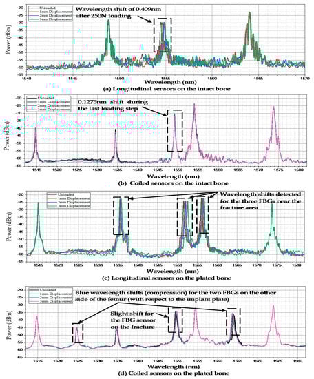 The wavelength spectrum after the first loading test process demonstrated that the highest wavelength shift occurred in the middle shaft sensor. The Bragg wavelength shifted from 1554.495 nm to 1554.904 nm after three steps of compressed loading. However, this shift was not noticeable in the other two FBGs, as shown in Figure 4a. The second test on the coiled FBG array of intact femur represented that the response of sensors to loading was relatively minor regarding the orientation of fixed gratings. Figure 4b shows that only the middle strain sensor reaction was detectable during the last loading step, which shifted by 0.1275 nm. During the third test, which was implemented on the plated sawbones, three FBG sensors near the fractured area presented dramatic wavelength shifts. According to Figure 4c, the peak wavelengths of the second and fourth gratings shifted by 0.341 nm and 0.471 nm, respectively. The maximum shift of wavelength of the third FBG was recorded by the middle shaft sensor, which was 0.544 nm. In the last test, seven peaks were monitored for the sensors on the coiled FBG array on the plated femur. The wavelength shift of the fourth FBG was 0.24 nm. Two FBG sensors recorded negative strain (compression) where their wavelengths showed blue shift, as shown in Figure 4d. The wavelength shifts noted for these two sensors were −0.07 nm (posterior linea aspera FBG) and −0.415 nm (posterior popliteal surface FBG).