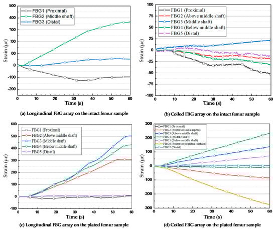 Strain measurements of FBG sensors under the applied compression loads. (a) Longitudinal FBG array on the intact femur sample; (b) Coiled FBG array on the intact femur sample; (c) Longitudinal FBG array on the plated femur sample; (d) Coiled FBG array on the plated femur sample.