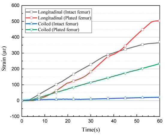 Any change in strain level as a result of bone displacement under a given load is related to the density of the recovering bone and its relative strength to a neighboring implant area [,]. Premature resumption of load-bearing activities may be harmful and could adversely affect the bone-healing process. As a result, at different stages of the recovery process, any type of load-bearing activity should be controlled and the consequent strain level should be monitored to prevent overloading or damage, which could delay the recovery process. Suitable load-bearing activities could be gradually prescribed to optimise the time of fracture recovery.