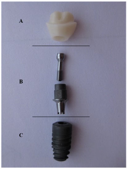 Hybrid-abutment used for this study; (A) zirconia abutment (B) Ti-Base (with screw) (C) Ankylos® implant.