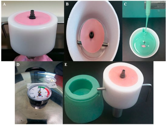 Fabrication of the sample cup holder for fatigue testing; (A) implants were screwed into heavy putty (Coltene whaledent, Altstatten/Switzerland). (B) Ti-Base abutment torqued to implant and ready to pour duplicate material. (C) Silicone duplicate material (Exaktosil N21, Bredent) poured into the cup. (D) Silicone replica put to set in a pressure pot to avoid porosity. (E) Silicone replica of the sample cup with the implant and Ti-Base abutment inverted and acrylic resin (Palapress vario, Heraeus Kulzer Wehrheim, Germany) poured in the mold and checked in the original chewing simulation sample cup for fitting.
