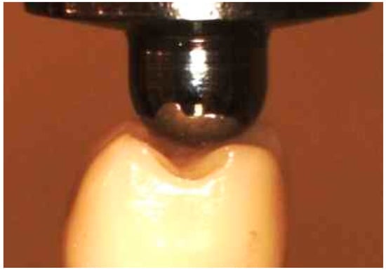 Both control groups (not subjected to Thermal Cycling Mechanical Loading (TCML) were subjected to compressive SLF loading test (Instron, Model 3367, Norwood, MA, USA) until failure. The compressive loading was applied on the crowns at three points (the triangular ridges of both lingual cusps and the disto-buccal cusp, as shown in Figure 4, at a crosshead speed of 1 mm/min [].
