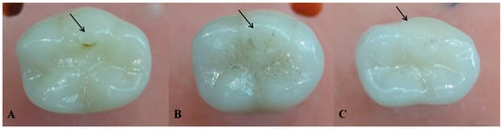 Wear facets at the indenter occlusal contact upon completion of the chewing simulation (arrows). (A) Milled lithium disilicate veneer, (B) hand-layered veneer, and (C) arrow indicating the chipping on the disto-buccal cusp at the indenter occlusal contact during chewing simulation.