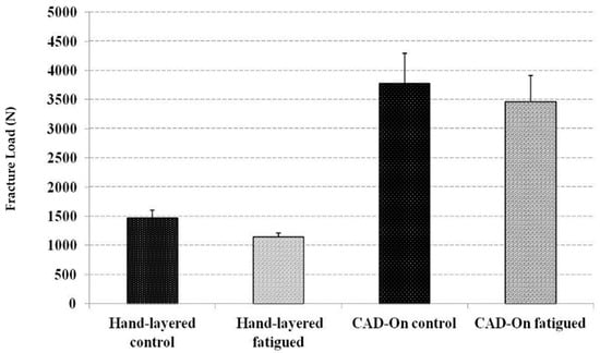Fracture resistance of crowns with CAD/CAM lithium disilicate veneer was significantly higher than that of the hand-layered veneers. Studies on tooth-supported crowns reported the same results with CAD/CAM veneered zirconia coping, displaying significantly higher fracture loads compared to the hand-layered veneers [,,]. Fracture load values of CAD/CAM lithium disilicate veneers reported in all the previous studies and in the current studies are all higher than the maximum chewing forces [,,].