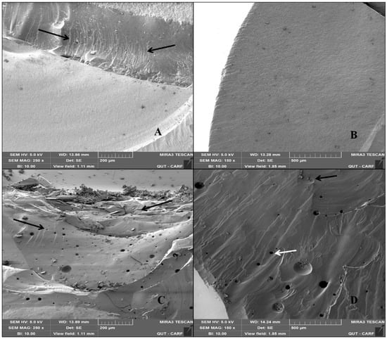 Representative SEM images of fractured surfaces for (A) milled lithium disilicate veneer at 250× showing hackle lines (arrows) and (B) buccal view of lithium disilicate veneer 150×, (C) view of the occlusal surface shows catastrophic chipping of the veneering porcelain (pointer) in the hand-layered veneer at 250×, (D) a buccal view of the hand-layered veneer showing wake hackles as a distinctive indicator of crack propagation (black arrow) as well as pores (white arrow).