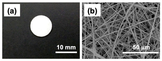 Macroscopic (a) and scanning electron microscopic (b) images of silica nonwoven fabrics.