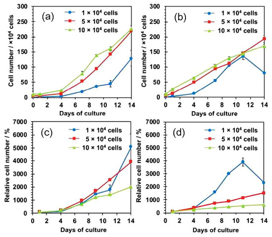 Proliferation profile of human MSCs cultured on three-dimensional (3D) SNFs and tissue culture-treated polystyrene (TCPS) plates with increasing day of culture. (a,b) cell number on the SNF (a) and TCPS plates (b) at different seeding densities, 1 (●), 5 (■), and 10 (▲) × 104 cells/well; (c,d) the ratio of cell number to those after 24 h of culture on SNF (c) and TCPS plates (d) at different seeding densities, 1 (●), 5 (■), and 10 (▲) × 104 cells/well. (S. E., n = 2). ACS Omega, Iijima et al. [36].