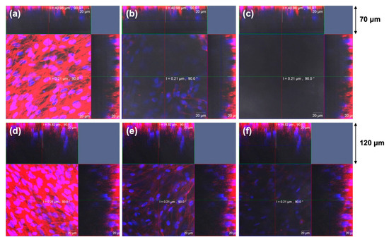 MSC proliferation on SNF was characterized by confocal laser scanning microscopy (CLSM) images after 7 days (a–c) and 14 days (d–f) culture at a cell density of 1.5 × 105. Single optical slices are shown near to the SNF surface [1.76 μm, (a,d)], middle [36.96 μm, (b,e)], and bottom [66.87 μm, (c,f)]. Hoechst 33,342 (blue) and Alexa Fluor 594 phalloidin (red) were used to stain cellular nuclei and skeletons, respectively. Scale bars: 20 μm. ACS Omega, Iijima et al. [36].