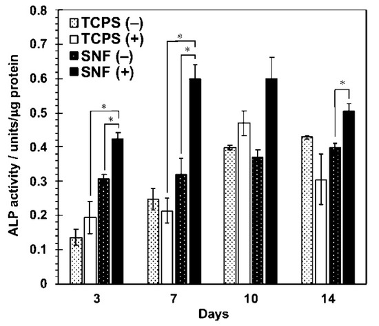 Alkaline phosphatase (ALP) activity of MSCs cultured on SNFs and TCPS plates under the normal medium (−) and the osteogenic differentiation medium (+). Data are shown as the mean ± S. E. (n = 4). * indicates significance (p < 0.05, Student’s t-test). ACS Omega, Iijima et al. [36].