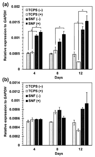 Expression of RUNX2 (a) and osteocalcin OCN (b) in MSCs cultured on SNFs and TCPS plates under the normal medium (−) and the osteogenic differentiation medium (+). The signal intensity was normalized using that of a control housekeeping gene (human GAPDH gene). Data are shown as the mean ± S. E. (n = 2). * indicates significance (p < 0.05, Student’s t-test). ACS Omega, Iijima et al. [36].