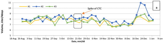 For the CTC plus tylosin, after a drop on October 22, and again on October 30, we witness a surge after that. Reactor #4 peaks on November 7 and reactor #6 peaks on November 19. Reactor #5 climbs steadily during this period. They start to drop in mid-November and reach their low at the end of November. Similarly, Figure 2b shows the same behavior, declining after the first spike until the end of October (last spike), followed by an upward trajectory. Likewise, this trend hits its bottom in early December.