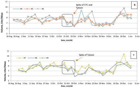 Biogas production in 2017–2018, (a) #1 low, #2 medium and #3 high concentration, before and after adding CTC, (b) #4 low, #5 medium and #6 high concentration, before and after adding both CTC and tylosin, and (c) #7 w, #8 medium and #9 high concentration, before and after adding tylosin and the dotted box shows the administration period of the VAs.