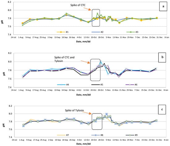By comparing before and after the addition of VAs, it is evident that reactors are experiencing a fluctuating pH status (Figure 3a–c). The graph shows that variations immediately after antibiotic spike have increased intensively, with a rising trend. Following up, in the first week of November, almost all reactors reach their plateau. From then on, the gradual decline continued until November 17. Subsequently, reactors seemed to recover themselves with an increase in pH. By the end of November, pH returns to its average level of around 7.8.