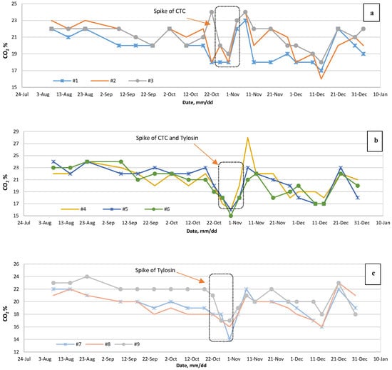 The concentrations of CO2 (a) before and after CTC spike, (b) before and after CTC plus tylosin spike, and (c) before and after tylosin spike and the dotted box shows the administration period of the VAs.