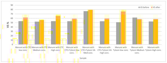 Values of VS in the digestate before and after VA addition are shown in Figure 5. In general, every treatment sample except for the medium tylosin concentration, showed an increase in the VS percentage after VA addition. The VS values agree with the slight fluctuations observed in Figure 2, Figure 3 and Figure 4, that the microbial communities were slightly affected by the VA addition and the biogas production was not halted. To recall, the initial manure VS loading was 2 g-VS/L/day and the sampling for VS were conducted between 6 and 10 days after the first injection and two days after the last injection of VA. Thus, it complies with reduction in methane production which was around 13–15% studied by Dreher et al. []. Angenent et al. [] also reported a temporary decrease in VS removal which recovered quickly. The average VS level before and after VA addition is 0.56% and 0.64%; and VS removal is 1.44% and 1.36%, respectively.