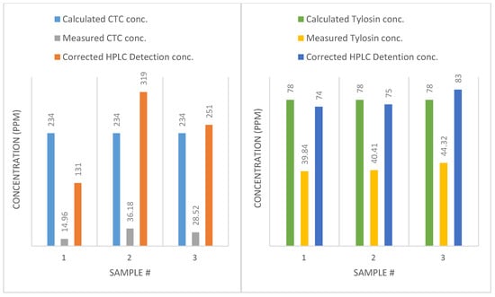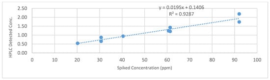 Based on the tylosin results being more consistent than CTC and Enrofloxacin results, the LC-MS/MS results of the digestate samples were meticulously scrutinized. Even though the LC-MS/MS detected concentration values of tylosin that were lower than expected, they were consistently proportional to the concentrations. For example, the expected concentration of tylosin was 20, 40, and 60 ppm for samples 4, 5, and 6, with zero degradation assumption, the LC-MS/MS values were 0.5, 0.9, and 1.2 ppm. No significant correlation for CTC was found. Figure 6 shows the LC-MS/MS results (Y-axis, ppm) vs. spiked values (X-axis, ppm). The consistently lower measured concentrations in the digestate samples and the high recovery rates in the water samples suggest that there was significant tylosin degradation due to the AD process.