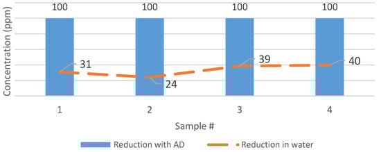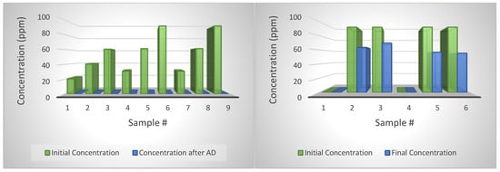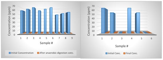 Running a T-Test on biogas data implies that AD bacterial activity was immediately inhibited for samples that have tylosin in them (Figure 2b,c) (p-value = 0.005). Still, the bacteria either adapted or the inhibiting compound was removed from the system after a few weeks. Biogas production was untouched for CTC samples, yet for the mixture of CTC and tylosin, and tylosin alone, it was significantly lower, immediately after VA addition. The tylosin concentration in this experiment was 92 mg/L and less, complying with the findings of Mitchel et al. []. They concluded that the bioreactor containing 92 mg/L tylosin had less biogas for nearly 30 d until the system recovered. The biogas reduction for samples with tylosin and CTC was close to 14%, and for tylosin, samples was between 8 and 19%, with no dose-dependent relationship. On the other hand, Chelliapan et al. [] found no biogas inhibition in an up-flow anaerobic stage reactor (UASR) containing 100–800 mg/L tylosin.