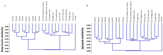 The statistical analyses were carried out using a two-sample t-test with unequal variances from the statistical analysis (R Core Team, 2013) to compare biogas inhibition between groups and between different VAs concentrations. Significance was accepted at probabilities p ≤ 0.05 for all analysis. In addition, for amplicon sequencing, Bray–Curtis similarities and Jaccard similarities methods are used for this comparison. The Bray–Curtis dissimilarity is a method used to measure the structural variation between two different groups, based on counts at each group. Mathematically, the index of dissimilarity is: