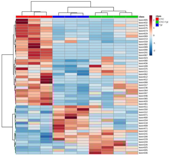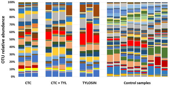 In total, twelve samples were collected into 50-mL sterile centrifuge plastic tubes. The first three samples were taken from CTC-added jars, with low, medium, and high concentrations, sampled 6 days after the first addition of VAs. The next three were sampled from jars with the addition of a mixture of CTC and tylosin on day 6 and day 10. The last group, including samples 9 to 12 were taken from jars administrated only with tylosin and were sampled on day 10 of VAs addition. Prior to sampling, each jar was mixed thoroughly with a hand mixer for 1 min. During the time after sampling and before starting the amplicon sequencing, samples were frozen to prevent any interference with oxygen. According to the TissueLyser II (Qiagen, Venlo, The Netherlands), samples were incubated at 70 °C for 20 min with intervallic vortexing. Then, samples were centrifuged at 5000× g for five minutes at room temperature, and the supernatant conveyed to a 1.5-mL Eppendorf tube. Next, ammonium acetate was added, mixed, incubated on ice and centrifuged. The supernatant was then blended completely with a unit volume of chilled isopropanol and for 30 min incubated on ice. Products were then centrifuged at 16,000× g for 15 min at 4 °C. The supernatant was evaporated and removed; the DNA pellet was cleaned several times with 70% ethanol and resolved in 150 μL of Tris-EDTA. The rest of the method was performed, according to Ericsson et al. [,].