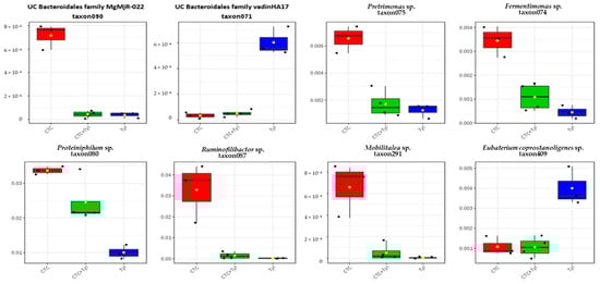 Box plots representing the relative abundance of 8 of the OTUs with the lowest p values.