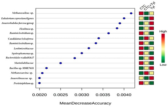 Finally, Figure 15 is a random forest analysis looking for “biomarkers” of each treatment group. The greater the “MeanDecreaseAccuracy”, the better that OTU is as a biomarker of the rankings shown to the right of the Figure. For example, Methanoculleus is apparently an excellent predictor of these groups by having a high relative abundance in the CTC samples and low abundance in the CTC + tylosin samples. Likewise, the Anaerorhabdus furcosa group and Flexilinea sp. can be found more on samples with high tylosin concentration and low CTC. Ruminiclostridium sp. can be abundant in conditions with high CTC levels and low tylosin.
