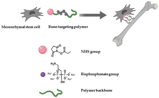 Delayed fracture healing in estrogen-dependent osteoporosis is associated with an increase in osteoclast activity and a decreased number of MSCs [28,29]. In this regard, the transplantation of MSCs is a promising approach for the treatment of bone pathologies especially in age-associated conditions such as osteoporosis [21,30]. However, the isolation of a clinically relevant number of autologous MSCs from aged individuals is problematic and the cells must be expanded in vitro. In turn, the in vitro expansion of MSCs alters its surface receptors’ profile and affects its homing ability compared to that of freshly isolated MSCs [31,32,33]. In addition, transplanted MSCs tend to home to the sites of abnormal cell proliferation such as breast cancer [34]. In order to overcome these limitations, we added bone-targeting moiety to MSCs through membrane engineering with bisphosphonate-containing polymers that have a high affinity for hydroxyapatite. The coating of MSCs with the polymer allowed the cells to bind specifically to the HA component of bone [22]. The in vitro polymer was shown to be non-cytotoxic while not interfering with the differentiating potential of the MSC. Besides having a targeting moiety, bisphosphonates also inhibit farnesyl pyrosphosphate synthase (FPPS), a key enzyme in osteoclast metabolism. Alendronate groups in the polymer preserved its functional activity compared to the therapeutic doses of commercially available alendronate analogues.