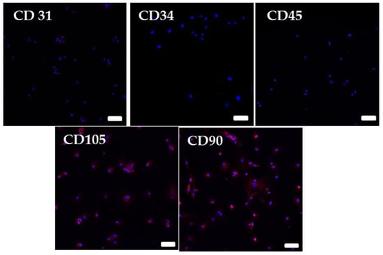 Immunofluorescent staining of the mesenchymal stem cells (MSCs) for the markers CD31, CD34, CD45, CD90 and CD105 with DAPI-stained nuclei; (calibration = 50 µm).