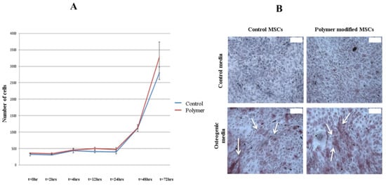 Effect of the polymer on the MSCs’ viability and osteogenic differentiation. (A) Cell viability assay (p = 0.383, one-way ANOVA); (B) the differentiation was performed for 3 weeks with Osteo Pro Differentiation Kit and assessed for early osteogenic activity with alkaline phosphatase (ALP) assay. Dense pink color is a marker for osteogenesis (areas shown with white arrows), 10× (calibration = 100 µm).