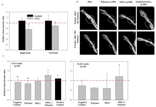 For the in vivo assessment of the fracture-regenerating potential of MSCs coated with bone-targeting polymer in osteoporotic conditions, we created a model of estrogen-dependent osteoporosis by OVX. There are different animal models that mimic post-menopausal estrogen-dependent type I osteoporosis and age-related type II osteoporosis. As most of the osteoporotic conditions correspond to the estrogen-dependent type, the OVX animal model is generally accepted and approved by the FDA [35].