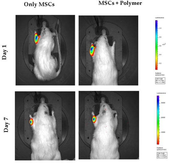 To monitor the dynamics of the interstitial distribution of the transplanted cells, the MSCs were transfected with Luc-LVT lentiviral particles. To detect the bioluminescent signal of luciferin, an in vivo optical imaging system IVIS Spectrum CT was used. The results of a bioluminescent analysis for the luciferase expression are shown in Figure 6. The luminescent signal was clearly detected within one week after cell transplantation in MSCs and MSCs + polymer group, and we did not see any significant difference in the luminescent signal in those two groups. However, the signal could not be detected by the end of the second week in both groups. This could be either because of a low number of survived MSCs or the migration of the transplanted cell deep into the bone tissue, which makes it difficult to detect a bioluminescent signal due to the limited resolution of the imager.