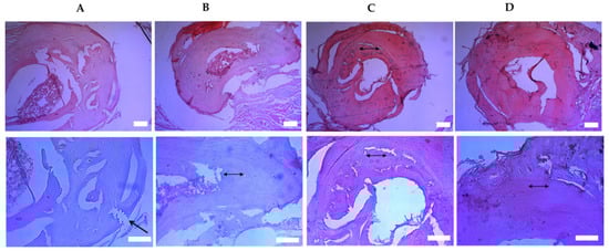 Histological changes within the fracture zones of ulna (cross-section) at 4 weeks after fracture (hematoxylin and eosin (H&E) staining; upper panel—10×, lower panel—20×). (A) PBS (negative control) group, showing fracture gaps, broken periosteum, endosteum; the broken end is clearly separated (an arrow), (calibration = 100 µm); (B) polymer group, showing immature bone tissue with fibrous tissue which started to close the fracture gaps (two-headed arrow), (calibration = 100 µm); (C) unmodified MSC group, showing bone regeneration and most of the bone tissue was connected to filling the gap (two-headed arrow), (calibration = 100 µm); (D) modified MSCs with a polymer group, showing the most prominent osteogenesis and the fracture gaps filled with bone tissue (two-headed arrow), (calibration = 100 µm).