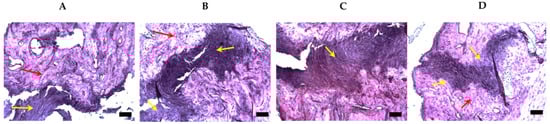 Longitudinal sections of ulna within fracture zones in 24 weeks upon fracturing (H&E staining; 10X). (A) PBS (negative control) group, showing multiple bone defects crossing the shear axis of the bones were still present. Bone tissue adjacent to the fracture showed moderate dystrophic changes (red arrow). Immature cartilaginous tissues (yellow arrow) filled in the fracture gaps (calibration = 100 µm); (B) polymer groups, showing uneven growths of immature cartilaginous tissues without clear boundaries in the fracture gaps (yellow arrows). There were also moderate to severe dystrophic changes in bone tissue (red arrow) (calibration = 100 µm); (C) unmodified MSC groups, showing outgrowth of the immature cartilaginous tissue (yellow arrow) and a large number of polymorphic chondroblasts chaotically distributed within cartilaginous tissue (calibration = 100 µm); and (D) modified MSCs with the polymer group, showing prominent osteogenesis and ossification (yellow arrows). Fracture gaps start to be filled with mature bone tissue. No pronounced dystrophic and degenerative changes in the bone sections (red arrow) (calibration = 100 µm).