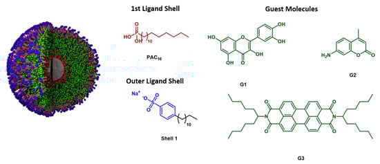 TiO2 NPs with a specific surface area of 46 m2/g (Table S1) and Al2O3 NPs with a specific surface area of 100.5 m2/g (Figure S2) were selected for our studies. Following a previously reported procedure, these NPs were covalently functionalized with hexadecylphosphonic acid (PAC16) in a wet chemistry approach [39]. After multiple washing steps consisting of redispersion in isopropanol and centrifugation, the core-shell nanoparticles [TiO2-PAC16] or [Al2O3-PAC16] were treated with an aqueous 1 mM solution of sodium dodecylsulfonate (shell1) to yield the nanoparticle hybrids [TiO2-PAC16]@shell1 or [Al2O3-PAC16]@shell1 [19]. The unique architecture resulting from this shell-by-shell (SbS) coating procedure enables the incorporation of hydrophobic guest molecules into the shell of these nanoparticles (Figure 1). This was previously demonstrated for a series of simple apolar compounds by Luchs et al. [20]. Our objective was to verify and validate the reversible incorporation of hydrophobic drugs within the SBS coating of TiO2 and Al2O3 nanoparticles, where the potentially successful drug delivery performance comprises the controlled drug transport and release into cancer cells. In addition to the anticancer drugs quercetin and 7-amino-4-methylcoumarin, a fluorescent perylendiimide was used to visualize the drug delivery and release performance of SbS coated nanoparticles by means of fluorescence microscopy and spectroscopy. To facilitate the incorporation, the hydrophobic guest molecules G1 (quercetin), G2 (7-amino-4-methylcoumarin) and G3 (perylendiimide) were dissolved in a minimal amount of acetone and added to an aqueous dispersion of [TiO2-PAC16]@shell1 or [Al2O3-PAC16]@shell1. The mixtures were sonicated and stirred in an open vial to enable slow evaporation of acetone. The non-complexed hydrophobic guest molecules precipitated out of solution and were removed by filtration. Further washing steps were conducted until no free guest was observed in the supernatant. Generally, the incorporation of hydrophobic guest molecules into the shells of [TiO2-PAC16]@shell1 or [Al2O3-PAC16]@shell1 led to an increase in hydrodynamic diameter and a color change from white to yellow (G1), light blue (G2), or red (G3) (Figure S3).