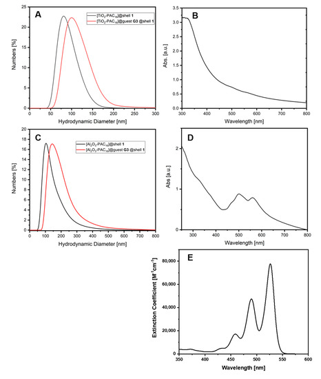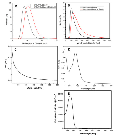 Comparison of the hydrodynamic diameter of the unloaded nanocarriers and the nanocarriers loaded with G1 (quercetin): (A) TiO2 nanocarriers, (B) Al2O3 nanocarriers; (C) UV/Vis spectrum of the unloaded nanocarrier [Al2O3-PAC16]@shell1; (D) loaded nanocarrier [Al2O3-PAC16]@guest G1@shell1 and quercetin in acetone (E).