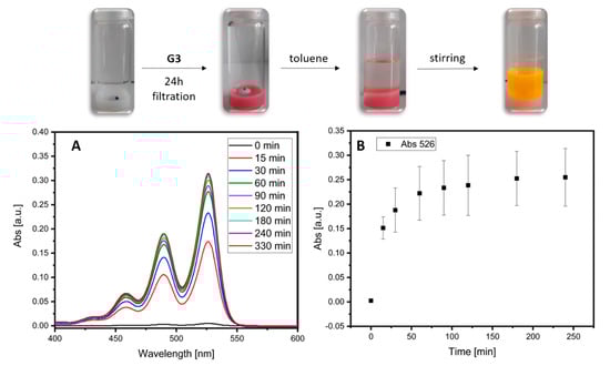 Time-dependent release of G3 from the loaded nanocarrier [TiO2-PAC16]@guest G3 @shell1 in a biphasic system (water/toluene). (A) Absorption spectra taken from diluted aliquots of the organic phase during measurement series 1. (B) Mean absorption at 526 nm plotted vs time.
