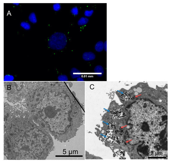 Fluorescence microscope image (A) of MCF-7 cells loaded with [Al2O3-PAC16]@guest G3@shell1 (cell nucleus (blue) nanocarrier (green); TEM images of MCF-7 cells without NPs (B) with [TiO2-PAC16]@guest G1@shell1 (C) in vesicles (blue arrows) and inside the cytoplasm (red arrows)