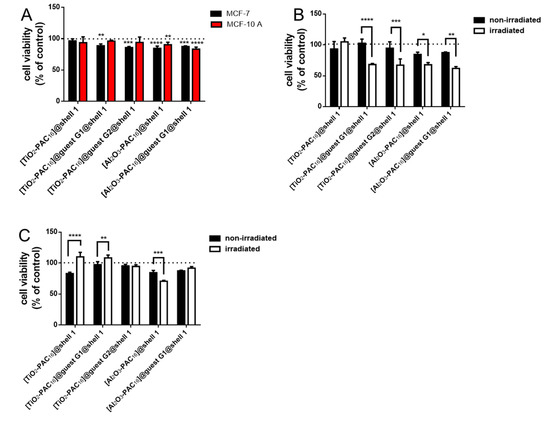 MCF-7 and MCF-10 A cells were treated with 25 μg/mL nanocarriers and the cell viability was tested after 24 h. The unloaded nanocarriers as well as those loaded with guest molecule G1 and G2 are biocompatible for both cell lines (Figure 6A). The [Al2O3-PAC16]@shell1 were a little more toxic than the [TiO2-PAC16]@shell1 for MCF-7 and MCF-10 A cells. The cell viability of cancerous MCF-7 cells when containing [TiO2-PAC16]@shell1 (96%) differs scarcely from the cell viability of MCF-7 cells loaded either with [TiO2-PAC16]@guest G1@shell1 (90%) or [TiO2-PAC16]@guest G2@shell1 (88%). Since the anticancer drugs quercetin (G1) and 7-amino-4-methylcoumarin (G2), which were dissolved in DMSO and added to the cell medium, significantly lowered the cell viability of MCF-7 cells significant more (Figure S10), the hydrophobic drugs remained adsorbed inside the nanocarriers after 24 h. Obviously an external stimulus is needed to open the shell around the nanocarriers and thereupon to release the anticancer drugs. As an external stimulus, X-rays were used. Our former research activities on applying iron oxide NPs in radiotherapy was based on the phenomenon that X-rays ablate surface structures from the iron oxide NPs. This implies that X-ray irradiation activates surface Fe2+ and Fe3+ that catalyze the Fenton and Haber-Weiss reaction, and highly toxic ROS are generated [40,49,50]. Hence, we expected that X-radiation damages the bilayer shell system of the intracellular nanocarriers and the cancer drugs will be released to the cytoplasm. To prove these expectations, the MCF-7 and MCF-10 A cells were incubated with unloaded and loaded nanocarriers system for 24 h and half of the samples were subsequently irradiated with a single dose of 1 Gy and the other half were kept non-irradiated as negative control. The cell viability of both test groups was determined and the value of the cells in medium without nanocarriers was used as 100%, the value at 0 Gy for the non-irradiated group and the value at 1 Gy for the irradiated group. The cell viability of the MCF-7 cells with internalized nanocarrier [TiO2-PAC16]@shell1 without any drugs remained the same whether they were irradiated or not (Figure 6B). This result demonstrated that unloaded [TiO2-PAC16]@shell1 are biocompatible. However, the nanocarriers [TiO2-PAC16]@guest G1@shell1 and [TiO2-PAC16]@guest G2@shell1, when incorporated in the cancerous MCF-7 cells, drastically decreased the survival of these cells. This indicated a release of the guest molecules G1 and G2 from the hydrophobic pocket after irradiation into the cytoplasm after irradiation of the cells, where they developed their anti-tumor effects. The difference between unloaded and loaded Al2O3 nanocarriers was not as visible as for the TiO2 nanocarriers, since the [Al2O3-PAC16]@shell1 NPs significantly diminished the cell survival after irradiation. In contrast to the MCF-7 cells, the cell viability of the non-tumorigenic MCF-10 A cells was not affected by the unloaded and loaded TiO2 nanocarrier systems at 0 or 1 Gy (Figure 6C). Quercetin (G1) can act as pro-oxidant or antioxidant depending on its intracellular concentration [27,30,31,32]. In case of coumarin derivatives, not only the dose is responsible for the pro- or antioxidant effect but also the structure of the used coumarin derivative [51,52]. Therefore, the coumarin (G2) shows a similar concentration dependency as quercetin (G1). As an antioxidant, it protects the non-tumorigenic MCF-10 A cells from the harmful radical generation of the X-rays. The dose of the quercetin released into the MCF-10 A cells was in the range so that the cells were protected against X-radiation. This effect was even larger for the Al2O3 nanocarriers. While the unloaded [Al2O3-PAC16]@shell1 damaged the MCF-10 A cells after irradiation, the cell viability even slightly increased after irradiation of MCF-10 A cells with [Al2O3-PAC16]@guest G1@shell1.