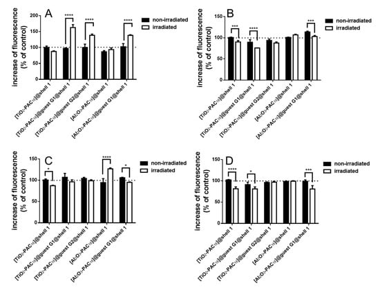 To clarify the anti- or pro-oxidative effect of the guest molecules, the change of the intracellular ROS levels was measured. The unloaded nanocarriers [TiO2-PAC16]@shell1 slightly reduced the ROS concentration in both cell lines after X-ray irradiation (Figure 7A,C), whereas the unloaded [Al2O3-PAC16]@shell1 nanocarriers increased the ROS concentration in the MCF-10 A cells (Figure 7C), when irradiated with 1 Gy. MCF-7 cells with [TiO2-PAC16]@guest G1@shell1 and [TiO2-PAC16]@guest G2@shell1 exhibit an increased ROS formation after irradiation in contrast to the MCF-10 A cells. This is in line with the results of the cell viability assay, where the cell survival of the MCF-7 is smaller than that of the MCF-10 A cells. Also, the concentration of the drugs released to the cytoplasm of MCF-7 cells is high enough for a pro-oxidative effect of G1 and G2. The same behavior can be found for MCF-7 and MCF-10 A cells with [Al2O3-PAC16]@guest G1@shell1. Bioflavonoids, especially quercetin, are known for their ability to scavenge the superoxide anions [53,54]. Therefore, the change of the superoxide generation was measured after irradiation with a single dose of 1 Gy. X-ray irradiation induces the formation of superoxide by mitochondrial membrane depolarization. The superoxide level significantly decreased after irradiation of the MCF-7 and MCF-10 A cells loaded with [TiO2-PAC16]@guest G1@shell1 or with [Al2O3-PAC16]@guest G1@shell1 (Figure 7B,C). For irradiated cells with [TiO2-PAC16]@guest G2@shell1, only a slight decline in superoxide concentration was observed for MCF-7 cells, but not for MCF-10 A cells. According to these results quercetin turned out to perform as a superior superoxide scavenger in comparison with 7-amino-4-methylcoumarin. Superoxide was disproportionated by quercetin to hydrogen peroxide and O2. This explains the increase in ROS generation inside the MCF-7 cells (Figure 7A). In contrast to the MCF-10 A cells, the level and activity of hydrogen peroxide scavenging enzymes such as catalase or glutathione (GSH) peroxidase are reduced in MCF-7 cells. Therefore, cancer cells like MCF-7 possess per se higher intracellular hydrogen peroxide levels and cannot cope with additional formation of hydrogen peroxide.