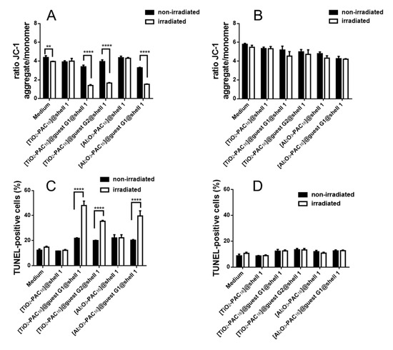 The increase of the ROS production caused by quercetin or coumarin is accompanied by a depolarization of the mitochondrial membrane potential [25,28,30]. Mitochondrial membrane potential (MMP) changes were measured with the dye JC-1 by accumulating inside the mitochondria. At high concentrations, this dye forms aggregates, which exhibit a red fluorescence. In case of damaged mitochondria, the membrane permeability is increased and the JC-1 dye is released from the mitochondria, leading to a much smaller concentration of this dye inside damaged mitochondria. For sufficiently lowered concentrations, JC-1 cannot aggregate and exists in its green fluorescent monomeric form. Thus, the ratio of red to green fluorescence determines the integrity of the mitochondrial membrane and, therewith, the change in its potential. [55]. X-ray radiation does not only induce ROS formation and DNA strand breaks, but also alters the functionalities of other cell organelles like the mitochondria. X-radiation increases mitochondrial ROS formation and membrane permeabilization [56]. MCF-7 cells cultivated in cell medium without any nanoparticles showed a significant decrease in the MMP (Figure 8A). No such effect was observed in MCF-7 cells with unloaded nanocarriers [TiO2-PAC16]@shell1 and [Al2O3-PAC16]@shell1. However, the X-ray induced depolarization of the MMP in cancer cells with quercetin and 7-amino-4-methylcoumarin loaded nanocarriers was remarkably large. This confirms that the X-ray triggered release of the anticancer drugs. In MCF-10 A cells (Figure 8B) the MMP did not significantly change independently of incubation of the cells with or without nanocarriers. A decrease of the MMP could lead to the release of cytochrome c out of the mitochondria which might activate the apoptotic pathways [27]. The induction of apoptosis or other cell death pathways is associated with the fragmentation of the DNA. DNA fragments can be stained with the TUNEL assay. The X-ray treatment was found to increase the fraction of TUNEL stained MCF-7 and MCF-10 A cells in nanoparticle-free medium (Figure 8C,D and Figure S11). X-ray irradiated MCF-7 cells, when incubated with [TiO2-PAC16]@guest G1@shell1, [TiO2-PAC16]@guest G2@shell1 and [Al2O3-PAC16]@guest G1@shell1, exhibit a drastic increase of TUNEL staining (Figure 8C). Quercetin and 7-amino-4-methylcoumarin did not only depolarize the MMP but also caused cell death, most probably apoptosis, via the mitochondrial pathway. In contrast, we did not observe any increase in DNA fragmentation in irradiated MCF-10 A cells containing drug loaded nanocarriers (Figure 8D). The antioxidant effect of quercetin and 7-amino-4-methylcoumarin apparently protect the non-tumorigenic MCF-10 A cells against X-ray induced destruction.