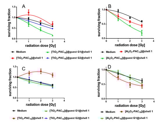 To elucidate the radio-sensitizing potential of the various nanocarriers, the clonogenic cell survival assay was performed. The survival curves of the unloaded [TiO2-PAC16]@shell1 (red line in Figure 9A,C) lies above the survival curve of the cells in medium without any nanocarriers (black line). The dose modifying factor (DMF) was calculated at a survival rate of 50%. All DMF values above 1 indicate radio-protection and below 1 radio-sensitization. The DMF value with 1.51 clearly identifies the [TiO2-PAC16]@shell1 as radio-protector for the non-tumorigenic MCF-10 A cells. Unfortunately, the survival curve of [TiO2-PAC16]@shell1 loaded cancer MCF-7 cells are also above the medium survival curve. With a DMF value of 0.99, the SbS coated TiO2 nanocarriers did not exhibit any radio-sensitizing effect, which is in contrast to other TiO2 nanostructures reported in literature [34,35,36,37]. However, the [TiO2-PAC16]@guest G1@shell1 and [TiO2-PAC16]@guest G2@shell1 internalized by the MCF-7 cells under X-ray exposure significantly reduced the survival of these cells (Figure 9A). With a DMF of 0.47, the nanocarriers loaded with quercetin acted as a more powerful radio-sensitizer than nanocarriers loaded with 7-amino-4-methylcoumarin (DMF 0.84). The survival curves of [Al2O3-PAC16]@shell1 lie below the survival curves of the cells in medium (Figure 9B,D). Al2O3 NPs develop a cytotoxic and genotoxic effect [57,58,59] and may also increase mitochondria-mediated oxidative stress [60]. As already shown by the viability studies, the cell viability of MCF-7 cells and MCF-10 A cells with [Al2O3-PAC16]@shell1 decreased after irradiation (Figure 6B,C). The rise in mitochondria-mediated oxidative stress was validated only in MCF-10 A cells treated with [Al2O3-PAC16]@shell1, in which X-radiation elevated the ROS formation (Figure 7C). However, Al2O3-PAC16]@shell1, when loaded with quercetin, decreased the survival rate of cancerous MCF-7 cells even more (Figure 9B). Interestingly, quercetin protected the non-tumorigenic MCF-10 A cells from the toxic effect of the Al2O3 nanocarriers, and the survival rate of MCF-10 A cells with [Al2O3-PAC16]@guest G1@shell1 was boosted (Figure 9D). All DMF values are listed in the Supplementary Table S4. Both the TiO2- and Al2O3-based nanocarriers loaded with quercetin did not only perform as excellent radio-sensitizer for MCF-7 cells and did not damage the MCF-10 A cells. [TiO2-PAC16]@guest G1@shell1 (DMF 0.47) is even a better radio-sensitizer than [Al2O3-PAC16]@guest G1@shell1 (DMF 0.50) and simultaneously acted as radio-protector for MCF-10 A cells (DMF 1.21). In a nutshell, the [TiO2-PAC16]@guest G1@shell1 are highly promising anticancer agents for combined cancer therapies.
