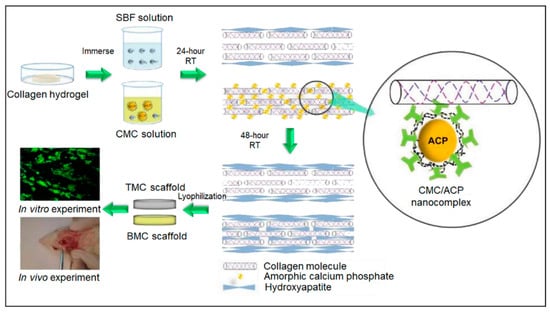 - Zhang, X.; Wang, Y.; Van Manh, N.; Wang, H.; Zhong, X.; Lia, C. Synergistic intrafibrillar/extrafibrillar mineralization of collagen scaffolds based on a biomimetic strategy to promote the regeneration of bone defects. Int. J. Nanomed. 2016, 11, 2053–2067. [Google Scholar] [CrossRef] [PubMed]