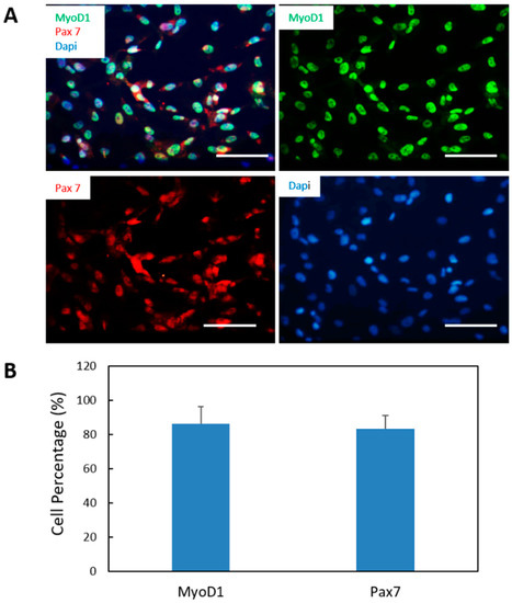 Pax 7 marker specifies satellite cells [23] and MyoD1 expression is necessary and sufficient for myogenesis [24]. Co-expression of both markers is associated with activated and proliferative myogenic progenitors [25]. Thus, the expression of Pax7 and MyoD1 was assessed by immunocytochemistry. One vial of myogenic progenitors were plated on coverslips and grown in myoblast expansion medium and evaluated. When the cells reached an appropriate density, the cells were fixed for immunocytochemical analysis. As displayed in Figure 2, cells were positive to both MyoD1 and Pax7, confirming that the cells were myogenic progenitors. Quantification of the immunocytochemistry resultindicated a high purity of myogenic progenitors in culture (MyoD1 86.4 ± 9.9%, PAX7 83.21 ± 7.8%) (Figure 2B).