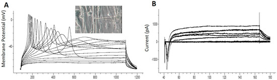 Electrophysiological analysis by patch clamp in Day 10 cultures. After 10 days of differentiation from myogenic progenitors, myotubes were sampled for patch clamp analysis. (A) Action potentials induced under current clamp conditions. The inset is an image of the recorded cell. (B) Sodium and Potassium currents recorded under voltage conditions.