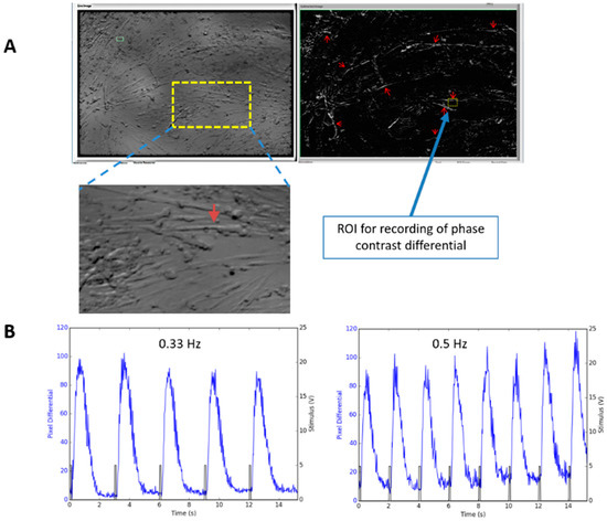The first assay was monitoring pixel differentials caused by myofiber contractions visualized utilizing a phase contrast microscope [18]. This method is applicable for analyzing myotube contractions on general 2D surfaces, especially their fidelity to electrical stimulation during increasing frequencies and for various durations. For recording, an iPSC-SKM culture was mounted on the stage of an upright microscope and stimulated to induce contraction. Field stimulation (2 V, duration 40 ms, square wave) with various frequencies (0.33–1 Hz) was applied and the contractions of the myotubes were recorded by measuring the pixel brightness changes caused by the contractions. Figure 6A,B demonstrated that the contraction of these myotubes can be reliably induced by controlled stimulation under the test frequencies.