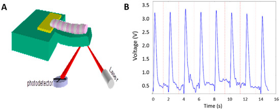 Measurement of iPSC-SKM contraction force on cantilever devices. (A) A diagram of the cantilever detection system illustrates that cantilever bending induced by myotube contraction can be detected by laser beam deflection. (B) A sample trace of myotube contraction recorded from cantilever bending.